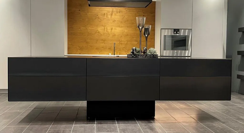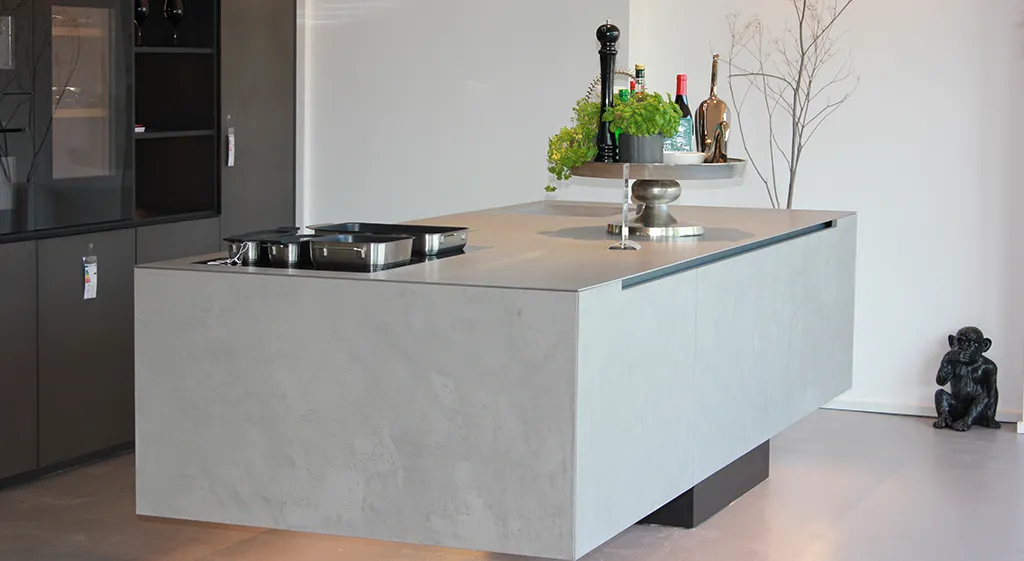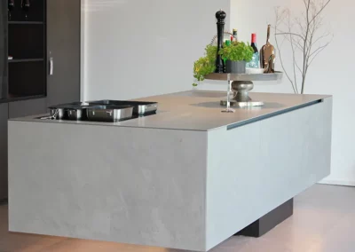 Die scheinbar schwerelose Anmutung verleiht der massiven Küche eine faszinierende Leichtigkeit. Das Herzstück unserer schwebenden Küche ist die Kücheninsel. Sie dient nicht nur als zusätzliche Arbeitsfläche, sondern wurde auch geschaffen, um das soziale Miteinander zu fördern. Mit dieser Innovation bieten wir unseren Kunden ein neues Designelement, das ihrer Küche eine Extraportion an Extravaganz verleiht. Die Verwendung von hochwertigen Materialien wie Hand gespachtelten Beton und Edelstahl macht sie zu einem einzigartigen Blickfang.